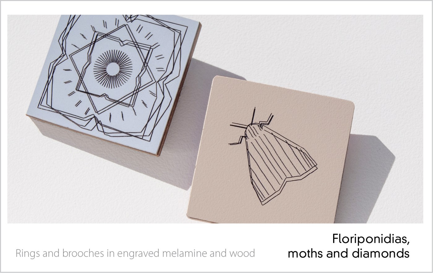 Brooches and rings made in engraved melamine and artisan plywood made with American walnut wood sheets, or industrial birch micro-plywood
